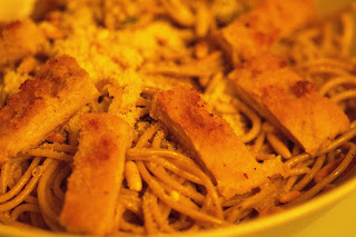 Zum Abendessen gab es dann Dinkel Spaghetti mit getrockneten Tomaten und Schnitzelstreifen. Ich hab vor ein paar Monaten bei Alles vegetarisch bestellt und dort unter anderem Sojamedaillons und Big Steaks bestellt. Letztere habe ich für die Schnitzelstreifen verwendet (lassen sich übrigens auch hervorragend grillen!).